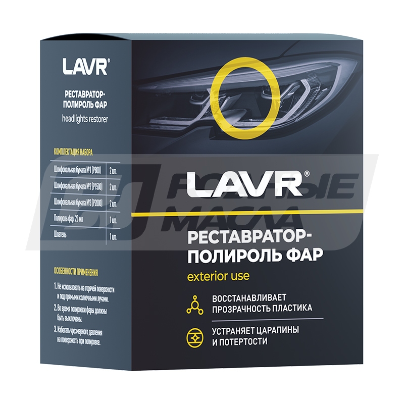 Полироль-реставратор фар LAVR – набор абразивных материалов и финишная паста для полировки пластиковых фар автомобилей. Средство возвращает прозрачность пластиковым фарам, удаляет царапины и помутнения, значительно увеличивает эффективность работы ламп. Особый состав обеспечивает продолжительный результат после полировки.